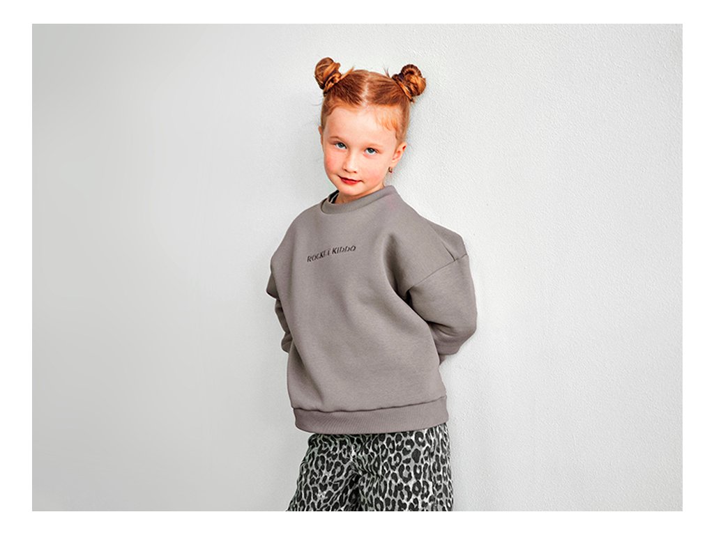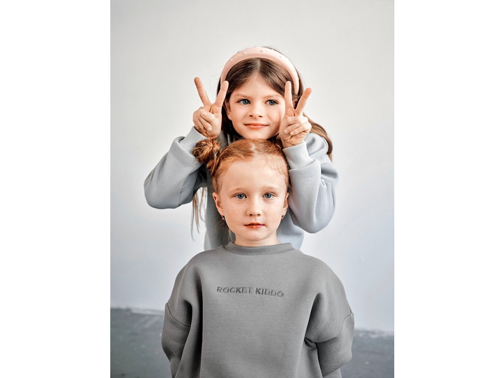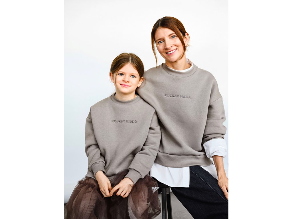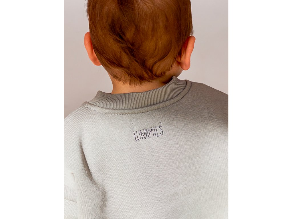 Our children's sweatshirt ROCKET KIDDO in a grey brown colour is part of the matchy-matchy collection DAYDREAM TOGETHER. It is made in the Czech Republic from a very pleasant cotton fabric and is OEKO-TEX® certified. It has a universal cropped cut and holds its shape nicely; you can wear it with sweatpants or a dress. The sweatshirt has a round ribbed neckline, drop shoulders and a wide ribbed hem. The inscription ROCKET KIDDO is sewn on the front, and the word Lunamies® is subtly embroidered on the back.