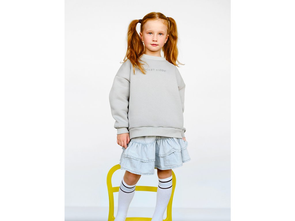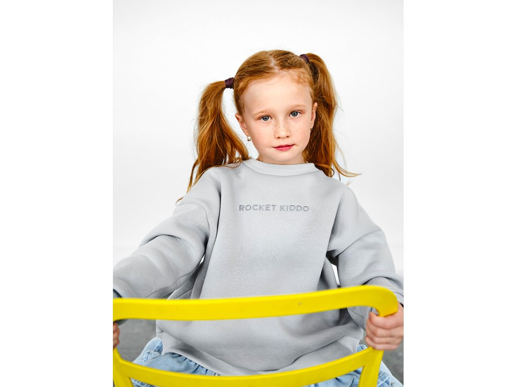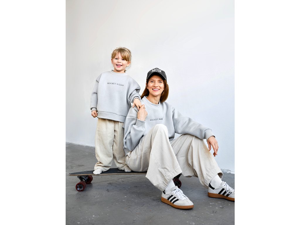 Our children's sweatshirt ROCKET KIDDO in a grey green colour is part of the matchy-matchy collection DAYDREAM TOGETHER. It is made in the Czech Republic from a very pleasant cotton fabric and is OEKO-TEX® certified. It has a universal cropped cut and holds its shape nicely; you can wear it with sweatpants or a dress. The sweatshirt has a round ribbed neckline, drop shoulders and a wide ribbed hem. The inscription ROCKET KIDDO is sewn on the front, and the word Lunamies® is subtly embroidered on the back.